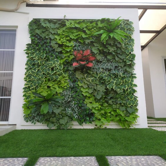 Taman yang di pasang secara vertical dengan pola dan bentuk yang di susun menggunakan tanama...